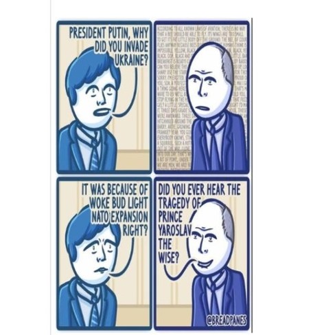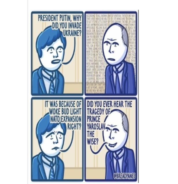 "value": "For several reasons, Putin and Russia have been at the top of the news in the past ten days.\n\nThis morning, Feb. 16, we learned of the death of Aleksei Navalny, age 47, in a remote Siberian prison above the Arctic Circle. No cause of death was yet given. But we know for sure only a few years ago, Navalny survived an attempt to kill him with a nerve toxin unavailable to anyone outside certain circles.\n\nRussia's courts imprisoned Navalny for a list of crimes. Included at the top was his opposition to Putin's 'special military operation' against Ukraine (In Russia, you can be busted simply for calling it a 'war\u2019). But Navalny committed a much greater 'crime,' leading a significantly powerful antifascist opposition to Putin's rule, one offering a different vision of both Russia's past and for a different and more democratic future. It's worth noting that minor parties are allowed in Russia's elections. But they must observe an unwritten rule carefully: always remain 'minor' and not too critical of the new tsar at the top. Whatever other charges were made against him, breaking this one made Navalny a subject of imprisonment and assassination plotting. Our theoretical piece in this week's issue offers a Navalny article published in 2022. Make what you will of it. We'll also include a report on Boris Kagarlitsky's recent re-imprisonment.\n Share this article on Twitter Facebook Mail\nBut a second matter, the topic of our weekly cartoon above, also put Putin on page one. Tucker Carlson had made his way to Moscow to interview Putin, not quite knowing what to expect. At the opening, Putin asked whether Tucker wanted 'a show' or 'a dialogue.' Tucker chose the latter, although it might be better described as a two-hour monologue.\n\nOur major media outlets plucked out a few juicy bits about Ukraine, but mainly panned Putin's talk as 'boring medieval history.' As Marxists, however, we're quite interested in history, both our own views of it and the views of our adversaries, both domestic and abroad. So boring or not, we looked it over.\n\nFor starters, Putin reminded us that Russia's history was long, over 1000 years, much richer, by implication, than any 250-year-old youngsters still wet behind the ears. What was more interesting is how he told it, not as a history from below but from the top. It was a tsarists' version of history (note that 'Tsar' is derived from the Russian version of 'Caesar'). For those of us familiar with Lenin's account of the Russian Empire as 'a prison house of nations,' the first thing we'll note in Putin's account is the absence of the term. It's replaced by Russia as 'family,' and a family that kept gathering a variety of lost relatives back into the fold, and thus welcome at family reunions.\n\nPutin starts in the 900s CE, but really attributes the first in-gathering of relatives to Tsar Ivan IV, aka 'The Terrible,' 1547-1584. This Ivan was the first to be named 'Tsar of all Russia,' meaning he asserted dominance over the entire prison of nations and started the\u00a0streltsy\u00a0(standing army) and the\u00a0oprichniki\u00a0(secret ... to make it so. For curious reasons, Putin brushes over the first tsars, including the various Vladimirs. Most likely, the reason was they were Swedes or too intermarried with Swedes, and thus largely vassals of Swedes. The Swedes called the people in the area they dominated 'the Rus,' which is how Russia got its name.\n\nSo Putin plants a flag with Ivan IV and briskly moves forward, weaving a tale that quickly brings Ukraine into Russia's fold. It's not really a separate country, you see, even the name simply means 'lands on the edge' of the Empire. In brief, for Russia to be Russia again, this wayward cousin needs to be brought back to sit at the family reunion table. Those asserting otherwise are expressing the views of the Germans and, later, the Nazis who occupied that 'part of Russia' for a spell. Can a negotiated settlement with Ukraine bring an end to the conflict there? 'Of course,' Putin tells Carlson. But not without 'DeNazifying' the territory. Elsewhere, Putin had dismissed Lenin's position on 'self-determination, including the right to secede,' for all the imprisoned nations under the tsars, as simply a 'mistaken' viewpoint.\n\nMuch of this was reported, in bits, about Carlson's interview. But one fascinating piece was not, and it says something about Putin's views of fascism and World War 2. Today it's widely held, both by the left and others as well, that WW2 got its start with 'appeasement' at Munich followed by the Third Reich's takeover of Czechoslovakia and adsorption of Austria, then again followed quickly by Hitler's invasion of Poland, knowing full well, due to Poland's treaties, that this meant war with the U.K. and others in Europe.\n\n\n\nIf you like this article, please sign up for Snapshot, Portside's daily summary.\nEmail\n(One summary e-mail a day, you can change anytime, and Portside is always free.)\n Leave this field blank\nBut according to Putin, we would be wrong. Here's what he told Tucker:\n\n\"So before World War II, Poland collaborated with Hitler and although it did not yield to Hitler's demands, it still participated in the partitioning of Czechoslovakia together with Hitler. As the Poles had not given the Danzig Corridor to Germany, and went too far, pushing Hitler to start World War II by attacking them. Why was it Poland against whom the war started on 1 September 1939? Poland turned out to be uncompromising, and Hitler had nothing to do but start implementing his plans with Poland.\"\n\nSo the Poles started it by refusing to give up Gdansk. Hitler had no choice. In a way, Putin is telling us about today. Applying the same logic, his 'little green men' (aka, Russian volunteers with their military uniform's insignias removed and sent into the Dombas circa 2014), just wanted Ukraine's easternmost provinces (for starters). But the stubborn 'Nazified' rulers in Kiev refused to give